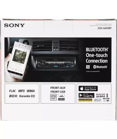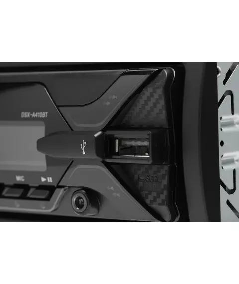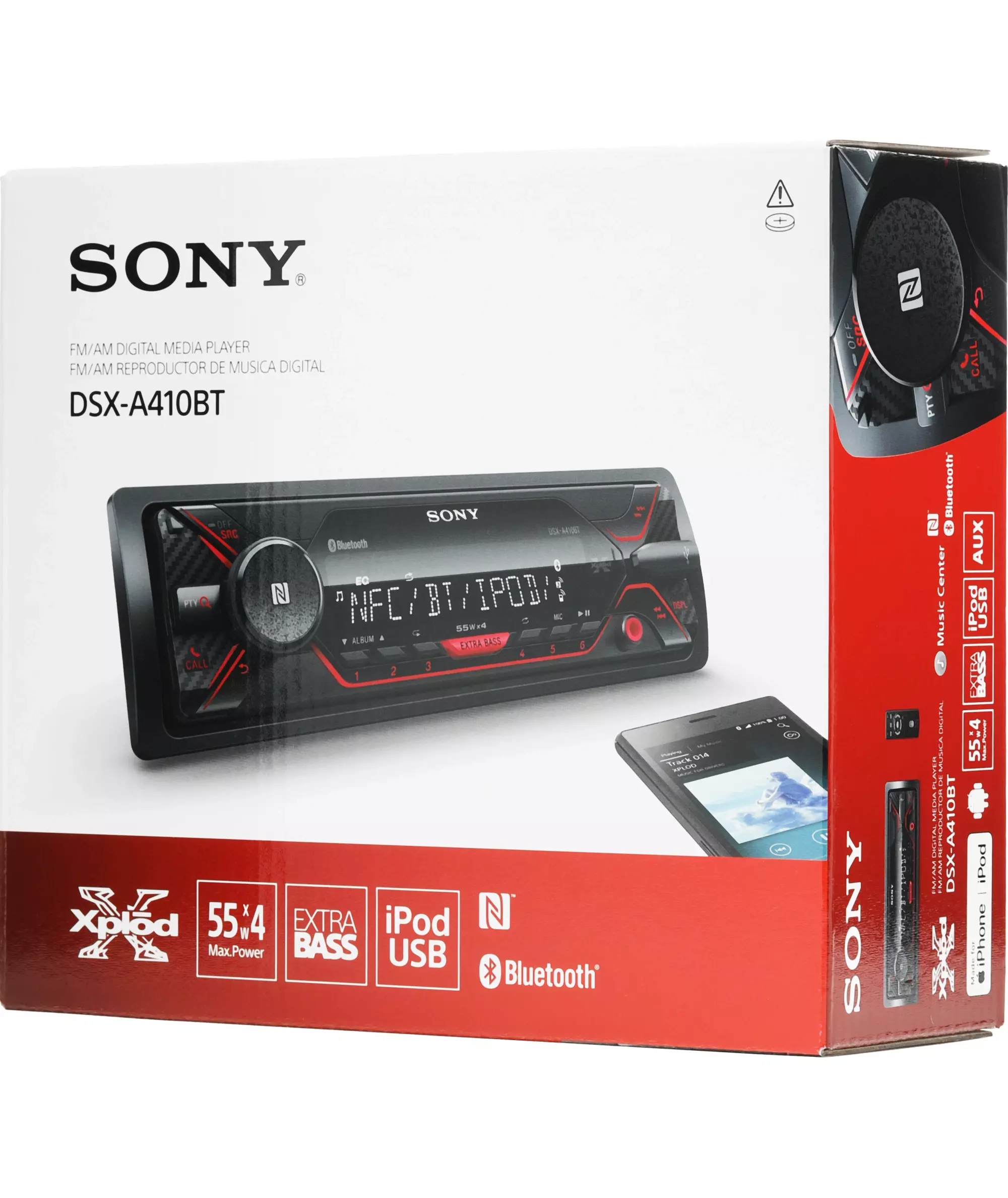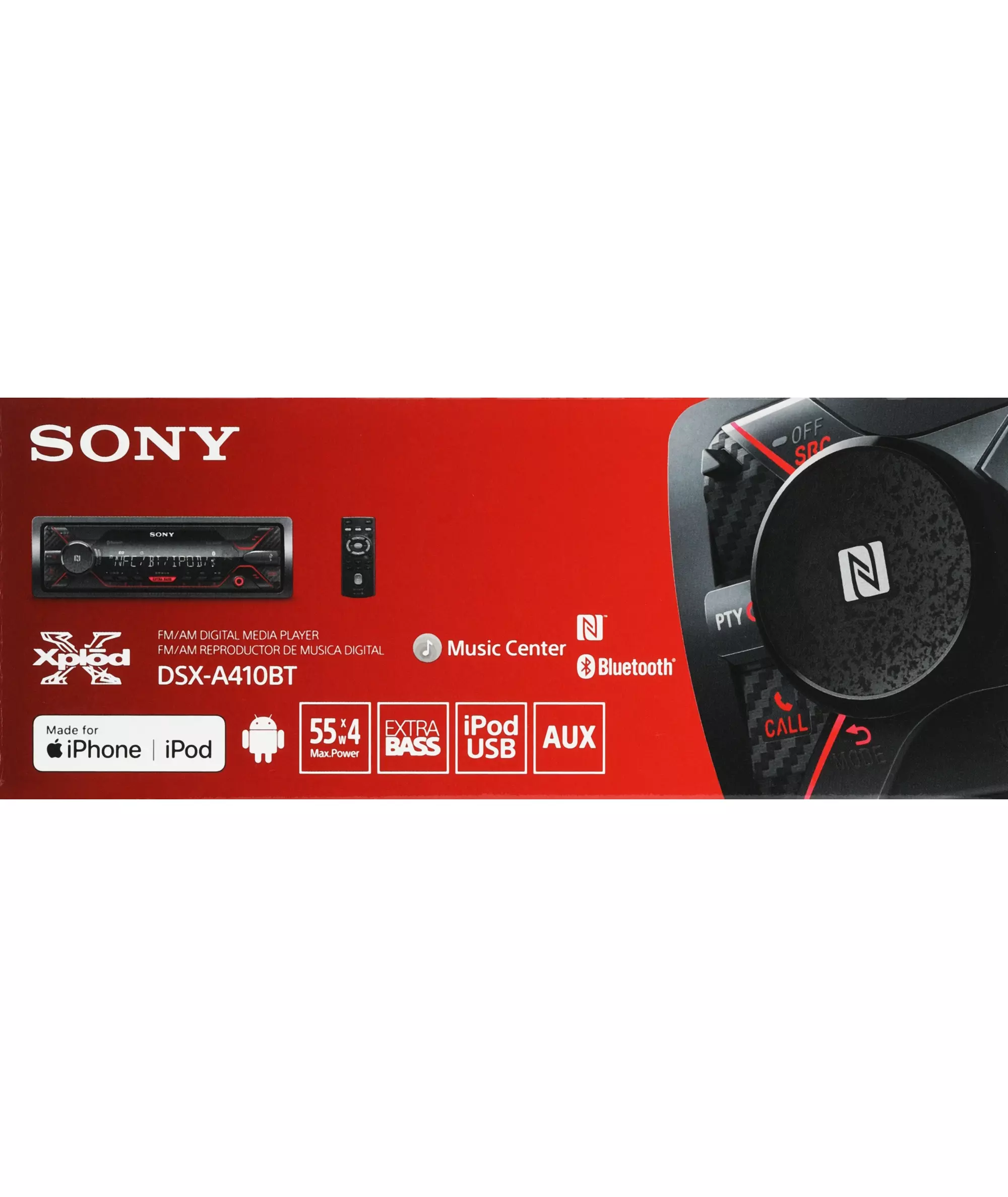Автопроигрыватель Sony DSX-A410BT с монохромным дисплеем. Возможность синхронизации с устройствами iPhone и iPod.