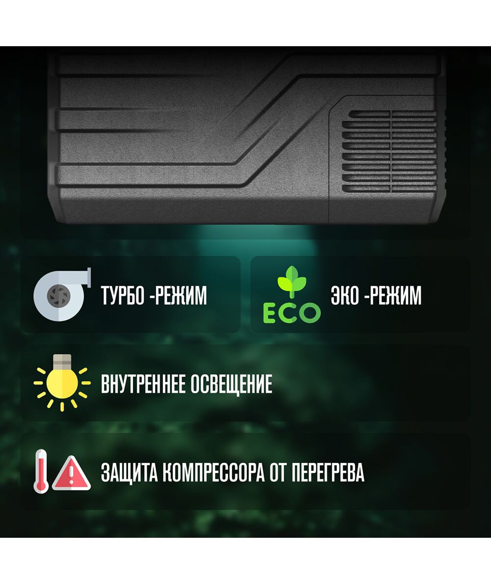 Высокопроизводительный компрессор, работающий от бортовой сети 12/24 В, поддерживает температурный диапазон от +20 до -20 °C. Чтобы быстро заморозить содержимое, можно включить режим MAX, при котором аппарат функционирует на максимальной мощности, а функция ECO направлена на экономичный расход энергии.