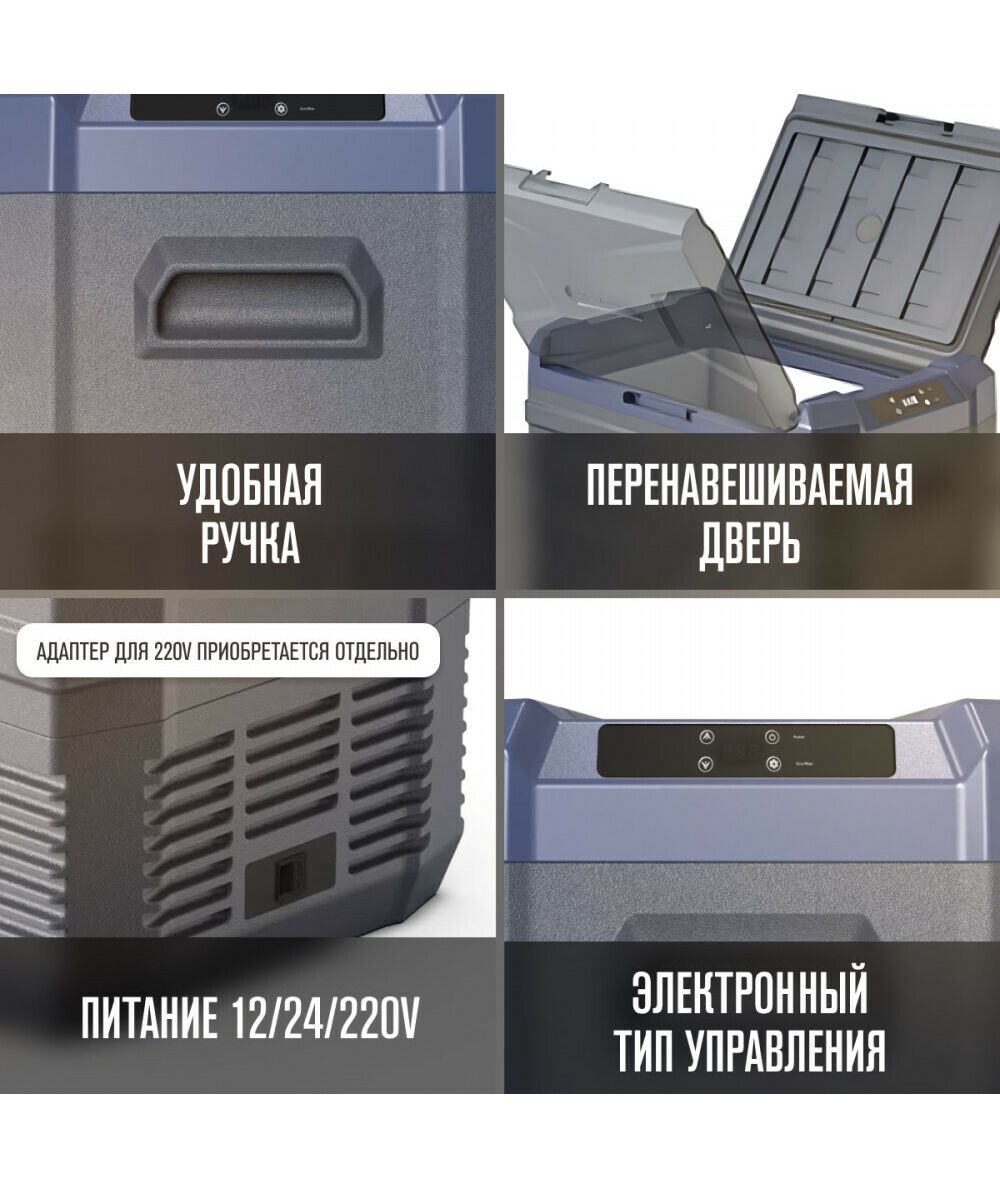 Надежная защелка двери не пропускает холодный воздух, гарантируя длительное сохранение нужной температуры. Для расширения функциональности предусмотрена возможность подключения устройства к бытовой сети 220 В с помощью отдельно приобретаемого адаптера.