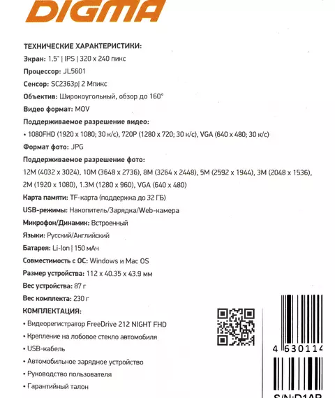 Описание Digma FreeDrive 212 NIGHT [FD212N]
