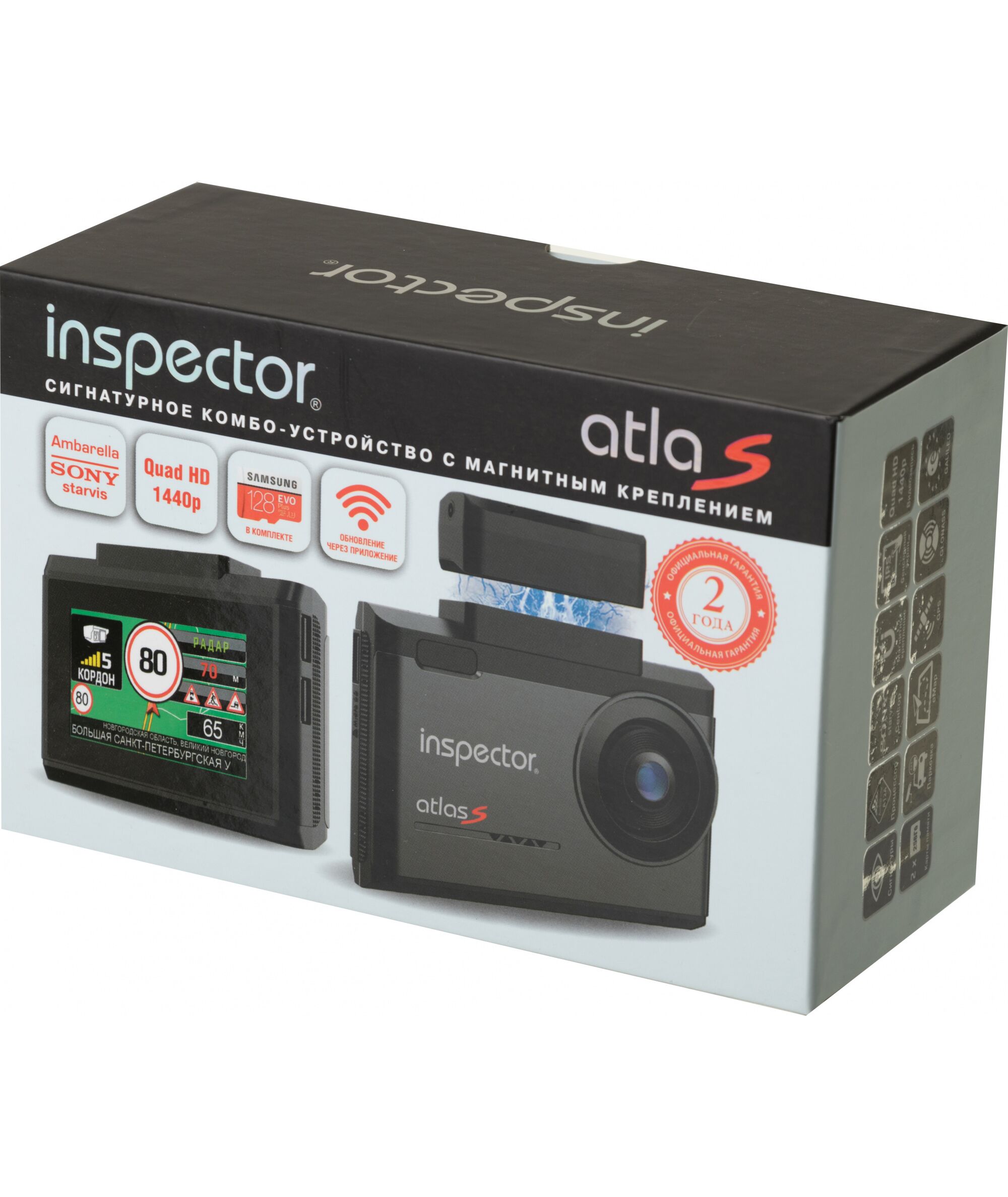 | Комплектация | Комбо-устройство INSPECTOR AtlaS, магнитное крепление для лобового стекла на скотче, кабель питания от прикуривателя, кабель питания для скрытой проводки, карта памяти 128 Гб, USB картридер для карт памяти microSD, инструкция, гарантийный талон |