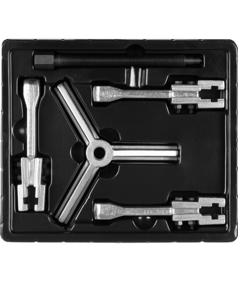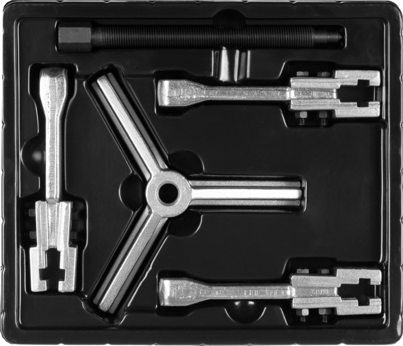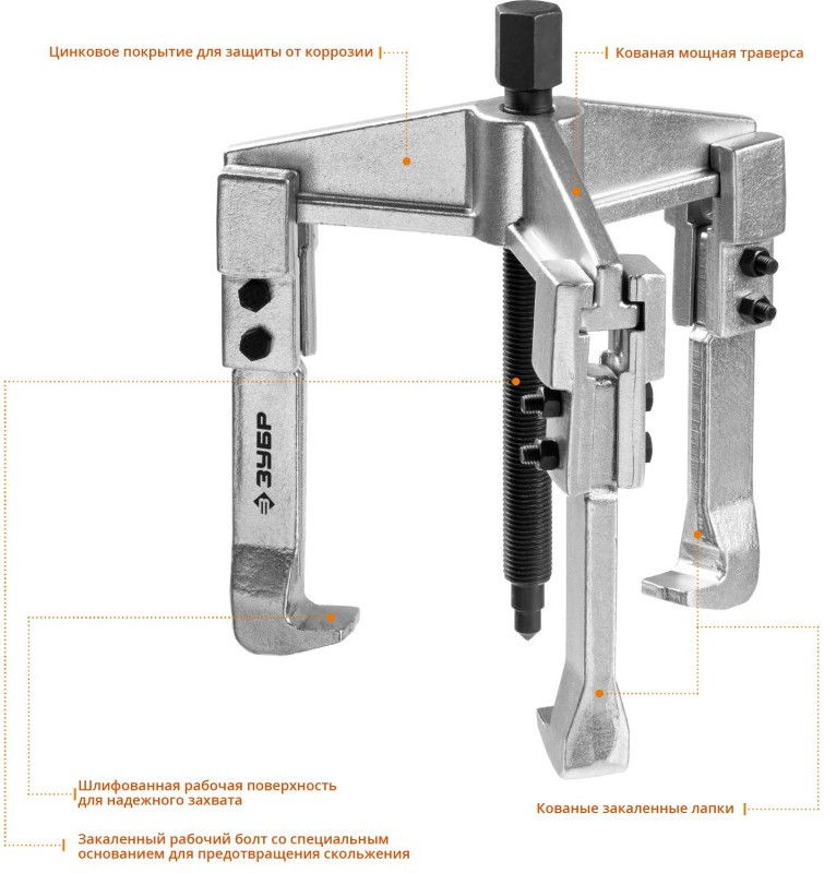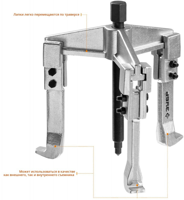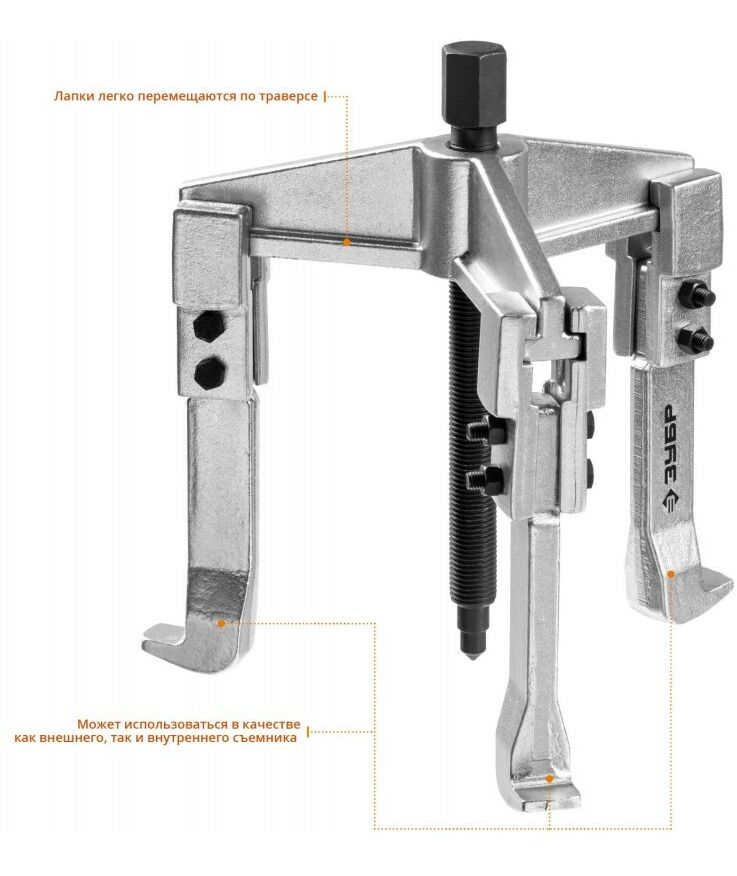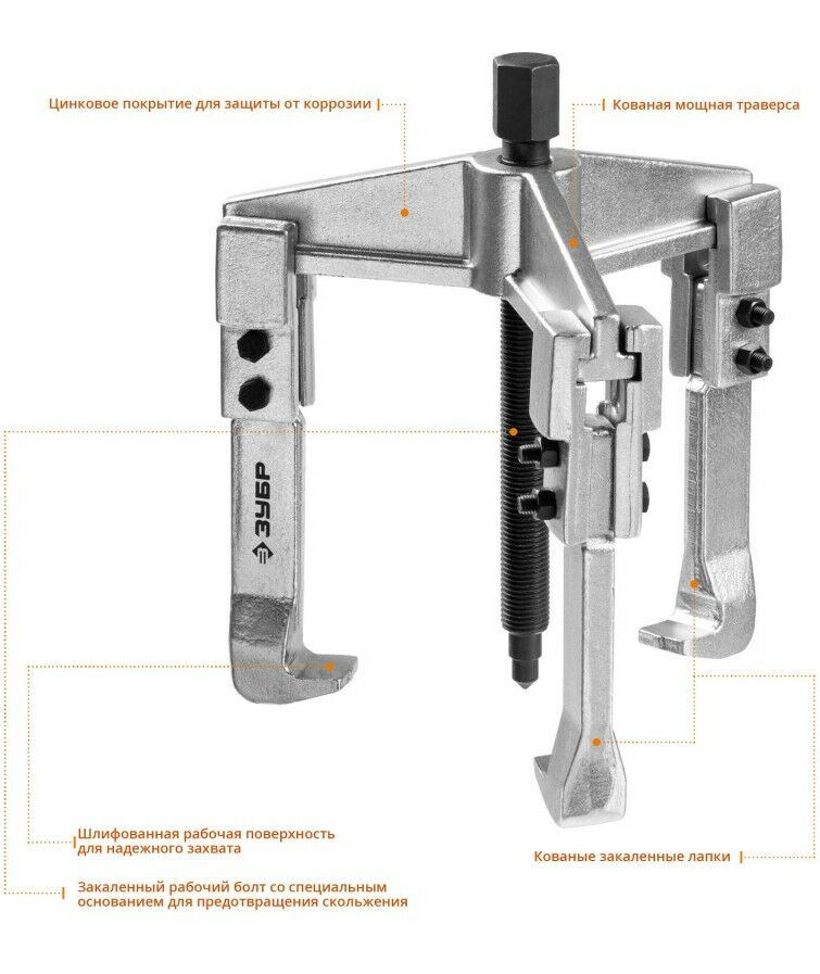 Захваты съемника выкованы из качественной инструментальной стали, что обеспечивает долгий срок службы при работе с высокими нагрузками. Позволяет работать с широким рядом узлов