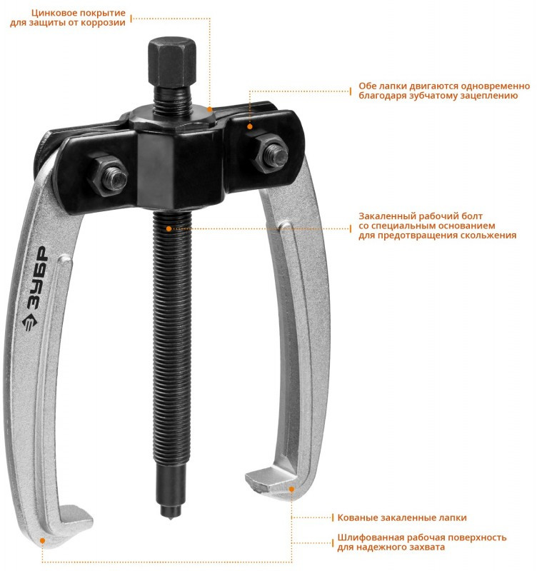 Захваты съемника выкованы из качественной инструментальной стали, что обеспечивает долгий срок службы при работе с высокими нагрузками.