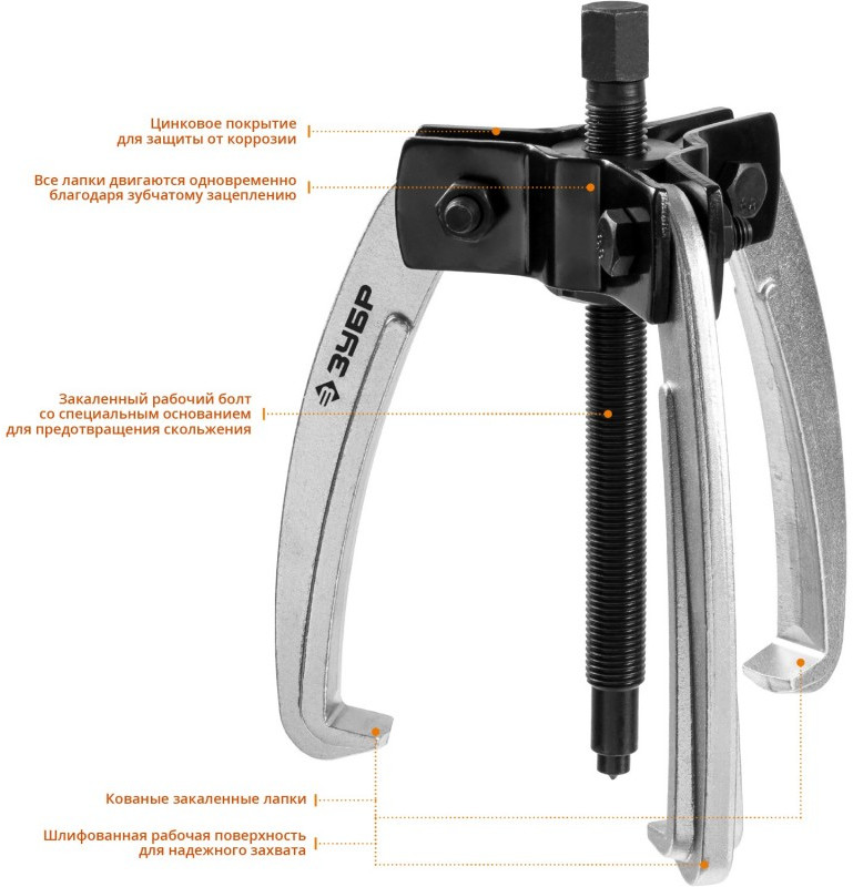Захваты съемника выкованы из качественной инструментальной стали, что обеспечивает долгий срок службы при работе с высокими нагрузками.