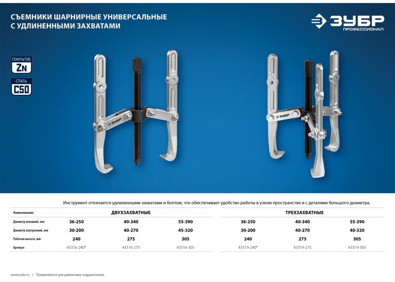 Захваты съемника выкованы из качественной инструментальной стали, что обеспечивает долгий срок службы при работе с высокими нагрузками. Позволяет работать с широким рядом узлов