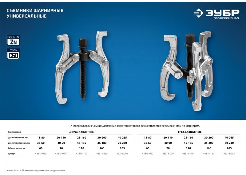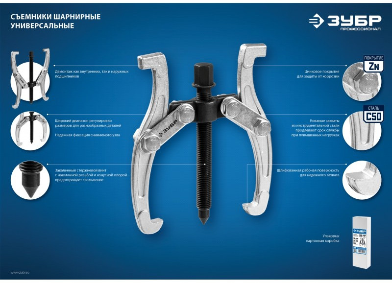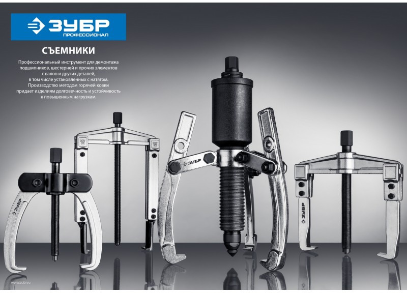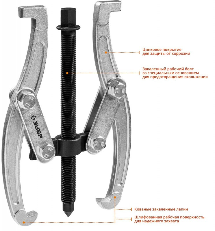 Захваты съемника выкованы из качественной инструментальной стали, что обеспечивает долгий срок службы при работе с высокими нагрузками. Позволяет работать с широким рядом узлов