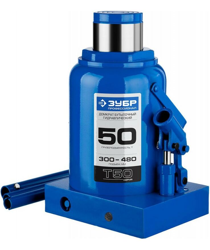 - Гидравлический бутылочный домкрат 50т, 300-480мм, ЗУБР Профессионал T50 43060-50_z01 обладает хорошей грузоподъемностью, которая обеспечивает эффективную работу в автомастерской при обследовании подвески и ходовой автомобиля