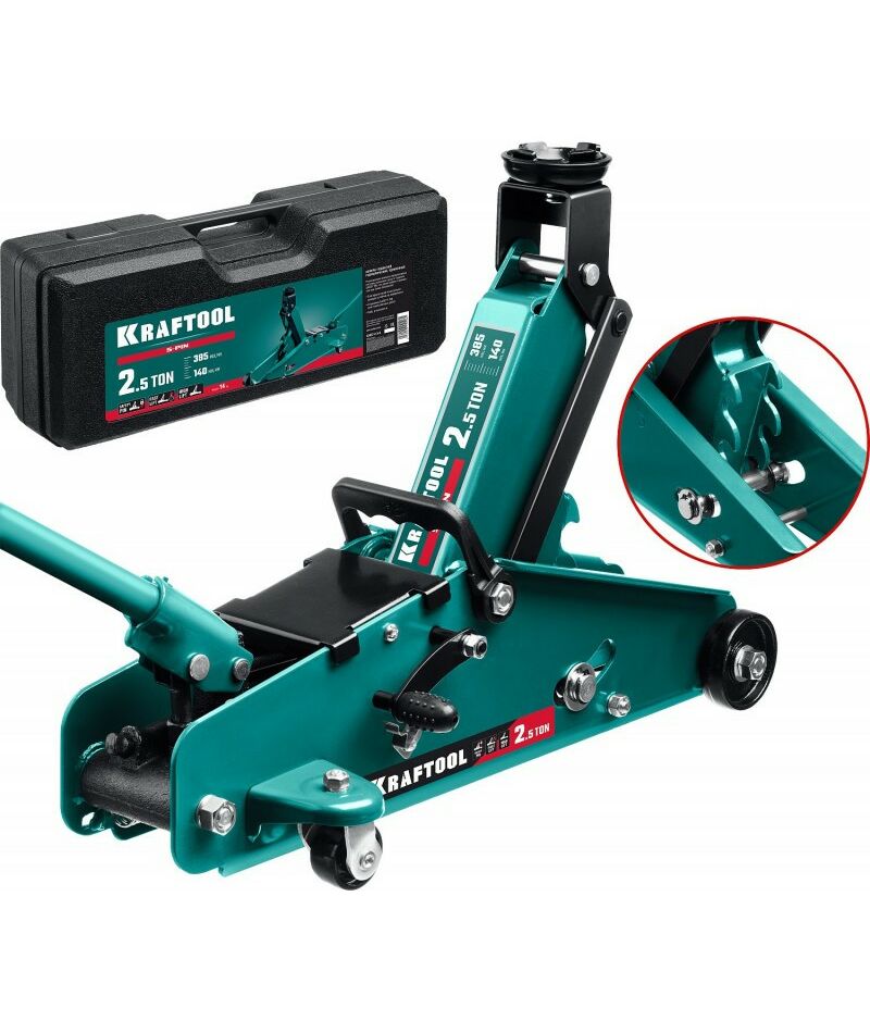 Подкатной домкрат KRAFTOOL S-PIN 2.5т 140-385мм с увеличенным подъемом и фиксатором в кейсе [43457-2.5-K]