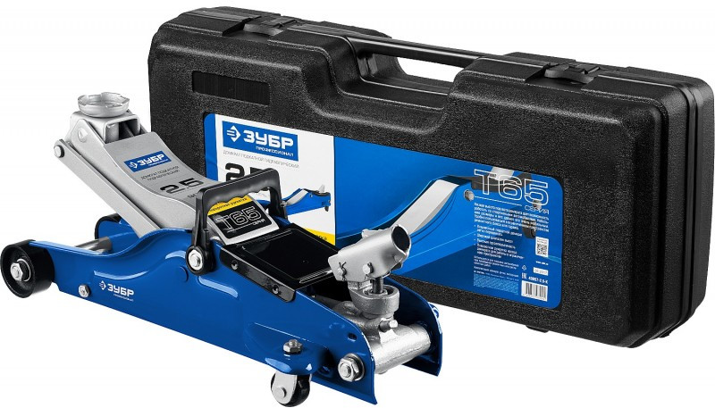 Подкатной домкрат Зубр Профессионал Т-65-K 2.5т, 90-360мм, с низким подхватом и поворотной ручкой в кейсе [43057-2.5-K]
