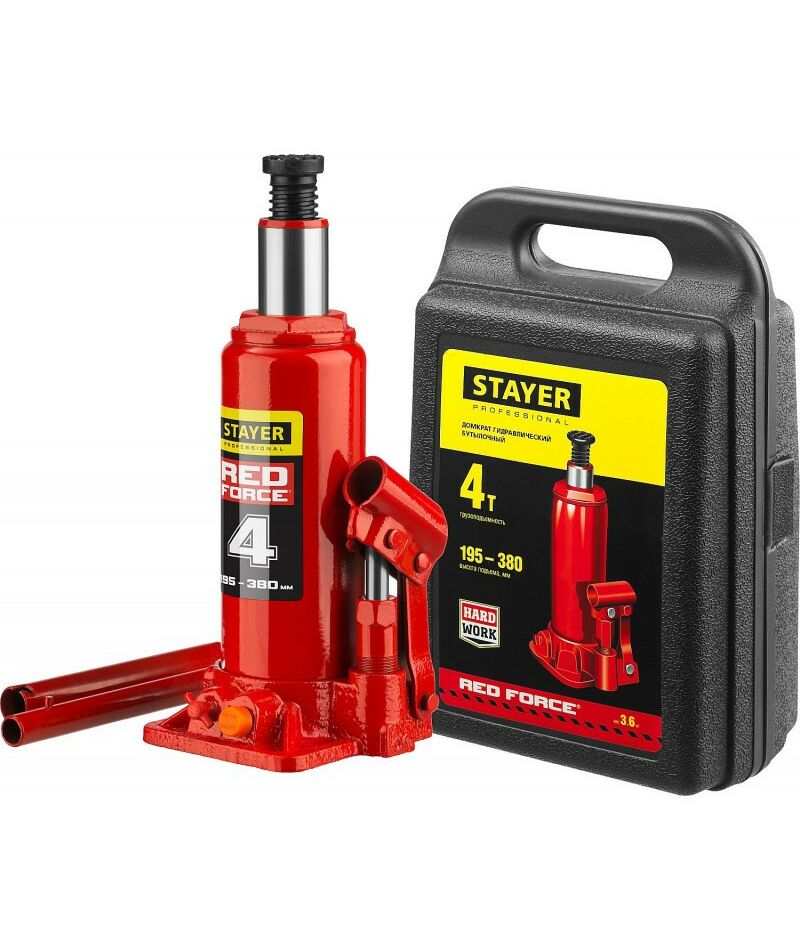 Домкрат бутылочный гидравлический STAYER RED FORCE 4т 195-380мм в кейсе [43160-4-K]