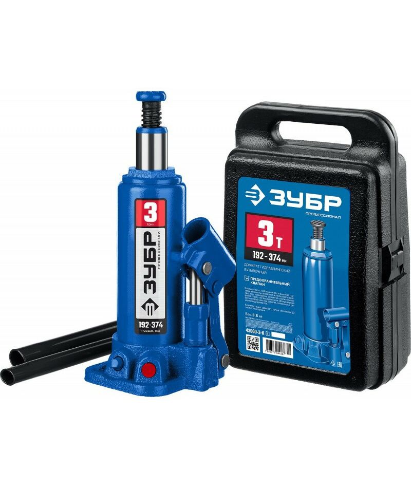 Домкрат бутылочный гидравлический Зубр Профессионал 3т 192-374мм в кейсе [43060-3-K_z01]