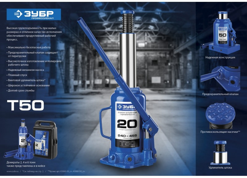 Компактность, небольшой вес и высокая грузоподъемность позволяет использовать домкрат при проведении ремонтно-строительных работах. Часто используется для обслуживания автомобилей или при работах связаных с ремонтом фундаментов.