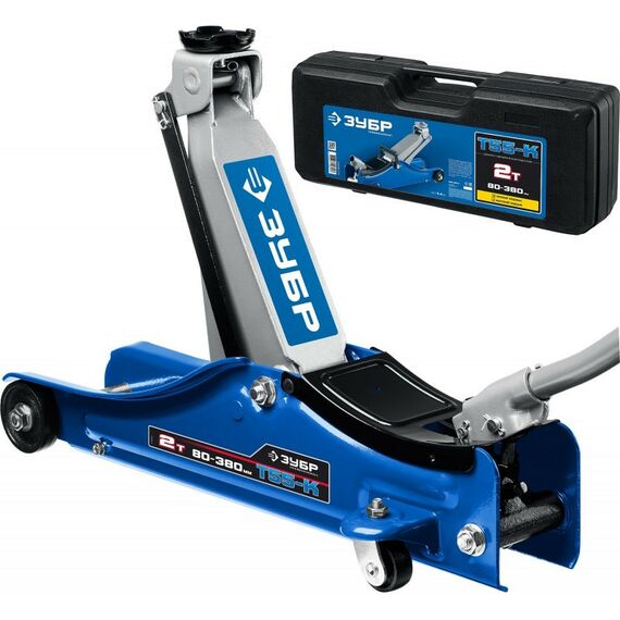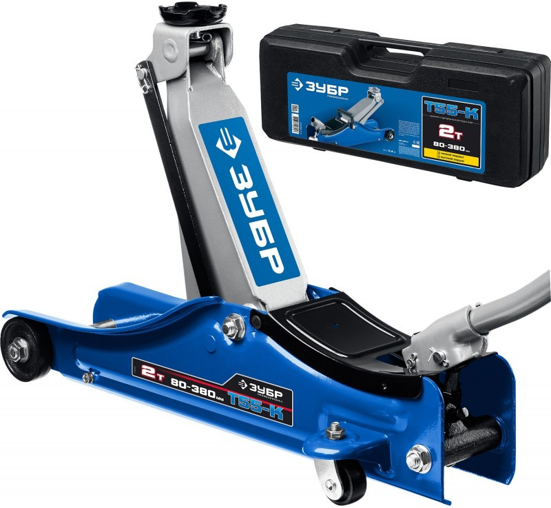 Подкатной домкрат Зубр Профессионал Т-55-K 2т 80-380мм с увеличенным подъемом и низким подхватом, в кейсе [43058-2-K]