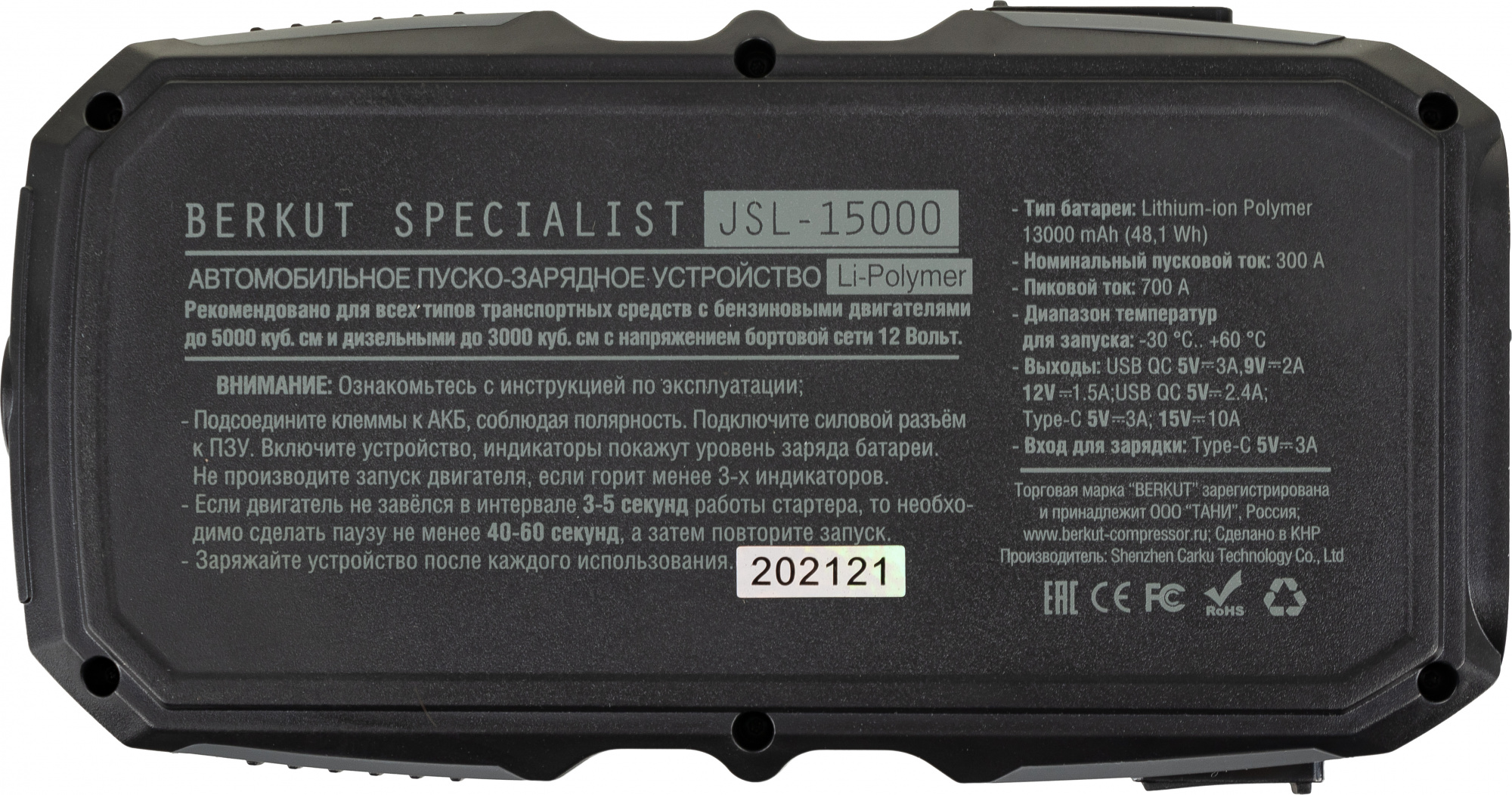 Это специальное пуско-зарядное устройство литий-полимерного типа предназначено для аварийного запуска двигателя транспортного средства в случае неисправной АКБ. Устройство подходит для любых типов транспортных средств с бензиновыми двигателями до 5000 см.куб. и дизельными до 3000 см.куб.