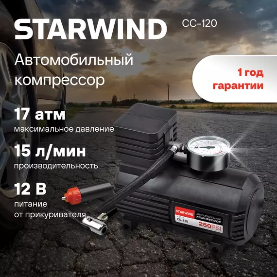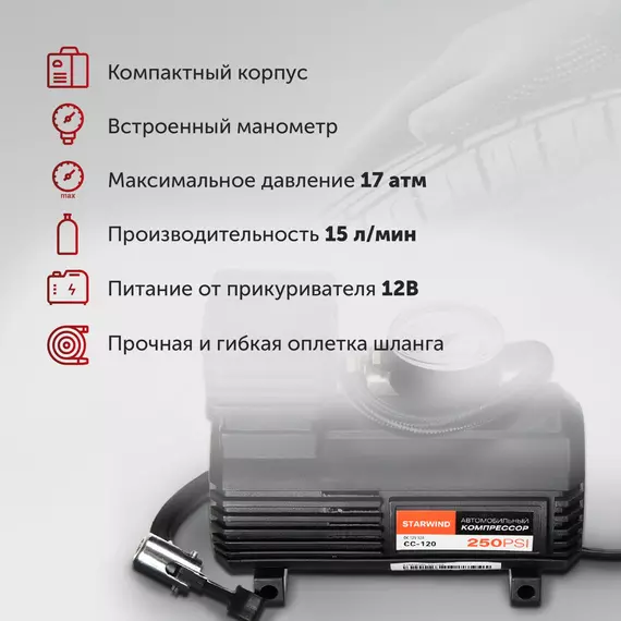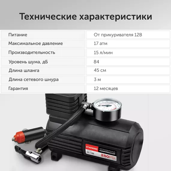 Автомобильный компрессор STARWIND CC-120 15л/мин шланг 0.45м