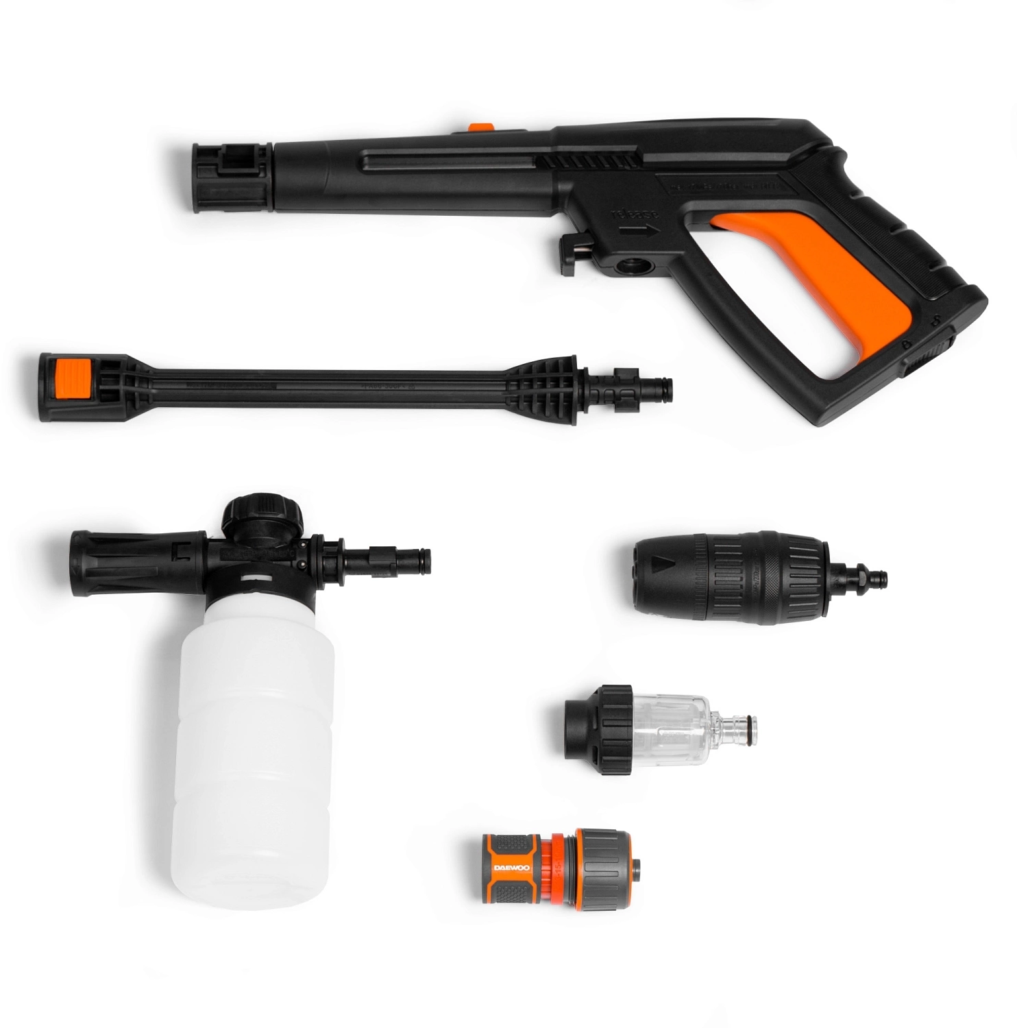 | Особенности | Электрический двигатель Daewoo; Самостоятельный забор воды; Встроенная емкость для шампуня; Пеногенератор в комплекте; Грязевая фреза; Автоматическое отключение; Фильтр тонкой очистки; Алюминиевая помпа; Армированный шланг высокого давления; Гарантия Daewoo. |