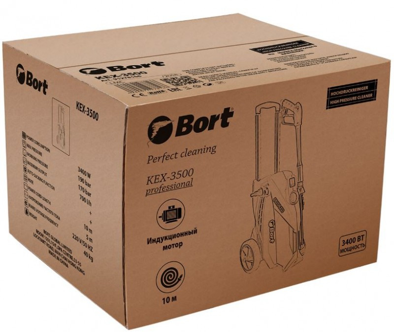 Профессиональная мойка высокого давления Bort КЕХ-3500 позволяет легко и быстро очистить сильно загрязненные поверхности. Мощный индукционный мотор обеспечивает производительность до 700 литров в час. Благодаря увеличенной длине шланга, которая достигает 10 метров, можно без проблем вымыть автомобиль или подъездную дорожку, очистить от пыли фасад дома или помыть загрязненное плиточное покрытие. Отличительной особенностью модели является функция самовсасывания, что обеспечивает эффективную работу в тех местах, где поблизости нет водопровода. Вы можете забирать воду из бочки, бассейна или канистры. Дополнительное удобство придают телескопическая рукоятка и функция QuickFix - возможность быстро подключить распылительные насадки. Функция автоматического отключения, например, при перегреве, обеспечивает дополнительную безопасность при использовании этой модели. Для удобного использования мойку можно расположить как вертикально, так и горизонтально. КЕХ-3500 – это идеальный вариант для владельцев собственных автомобилей, загородных домов, а также для использования коммунальными службами и клининговыми специалистами. В комплектацию входит шланг высокого давления и удобный пистолет – распылитель.