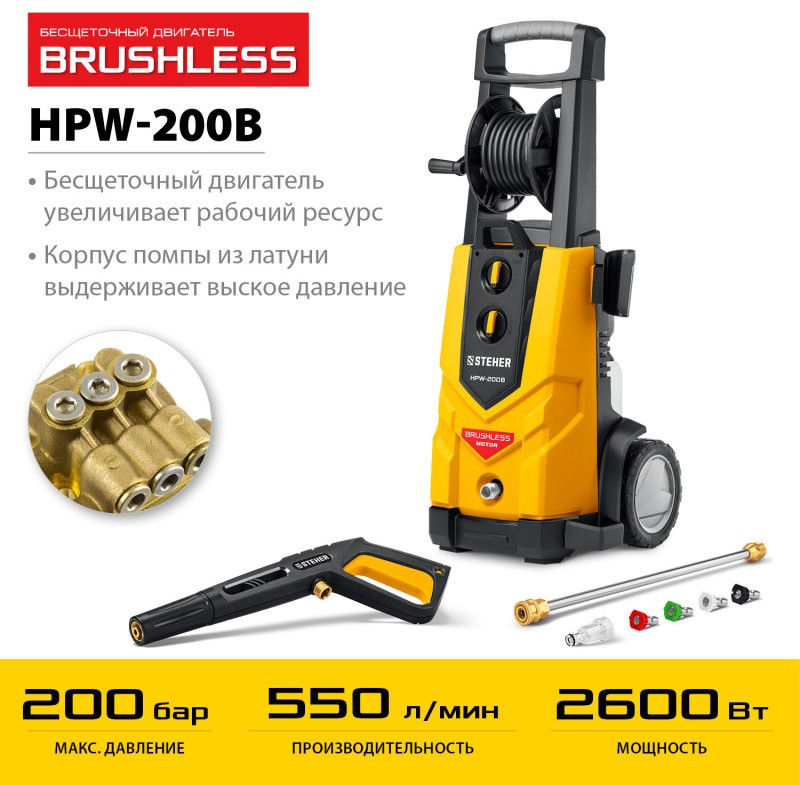 Мойка высокого давления STEHER HPW-200B STEHER 200 Атм, 2600 Вт, пистолет G-280 PRO