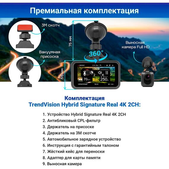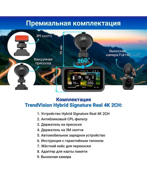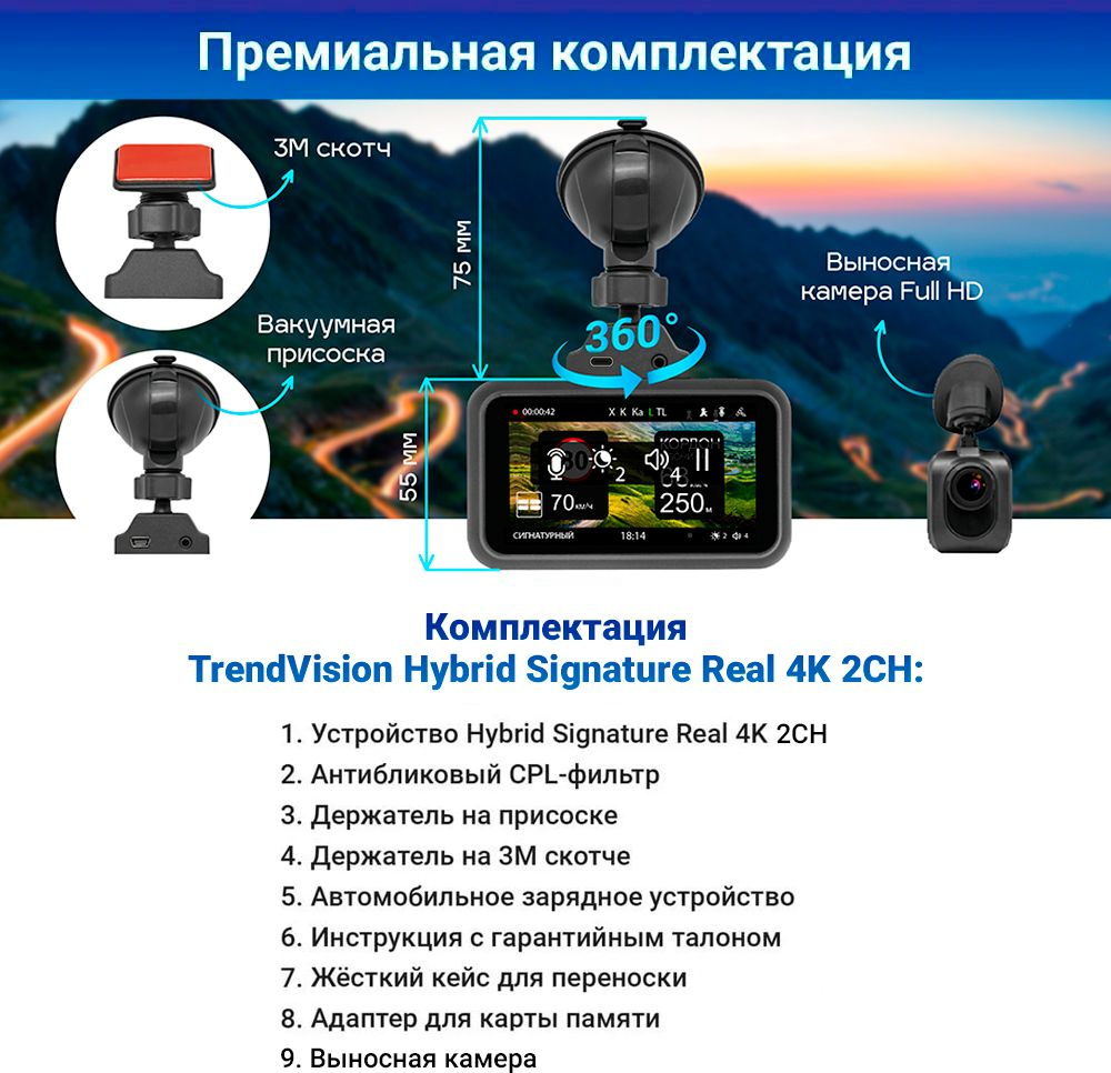 | Комплектация | Устройство Hybrid Signature Real 4K 2CHАнтибликовый CPL-фильтрДержатель на присоскеДержатель на 3М скотчеАвтомобильное зарядное устройствоИнструкция с гарантийным талономЖёсткий кейс для переноскиАдаптер для карты памятиЗадняя Full HD камера |