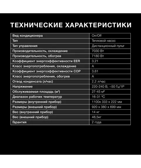 | Режимы работы | охлаждение/обогрев/осушение/вентиляция |