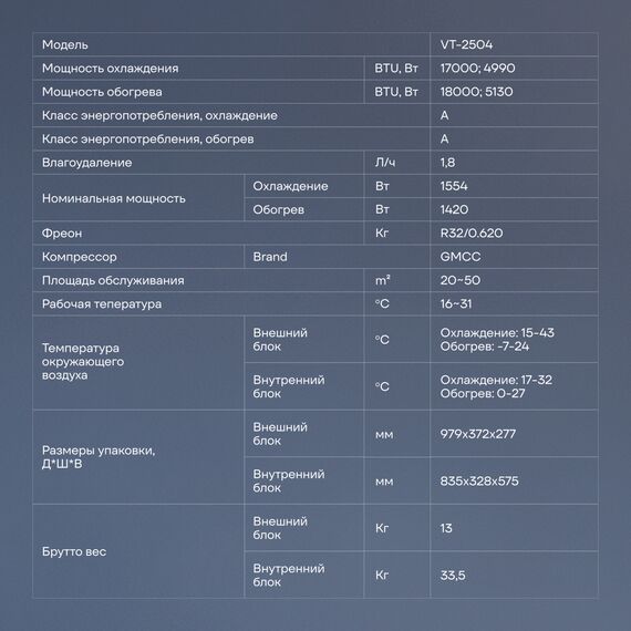 | Вес внешнего блока | 19.5 кг |