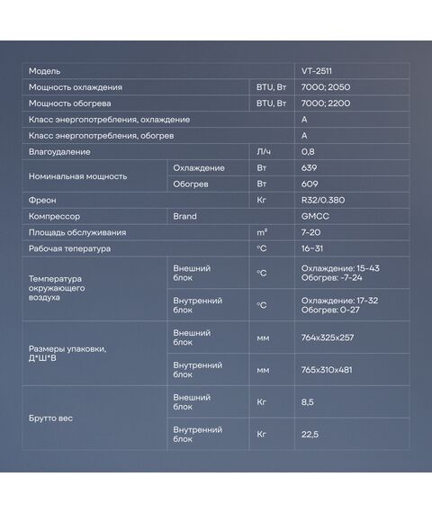 | Режимы работы | охлаждение/обогрев/вентиляция |