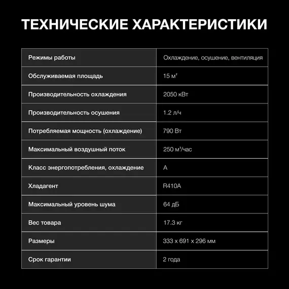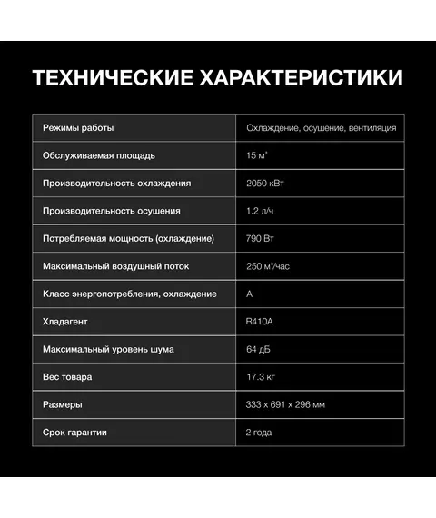 | Режимы работы | охлаждение, осушение, вентиляция |
