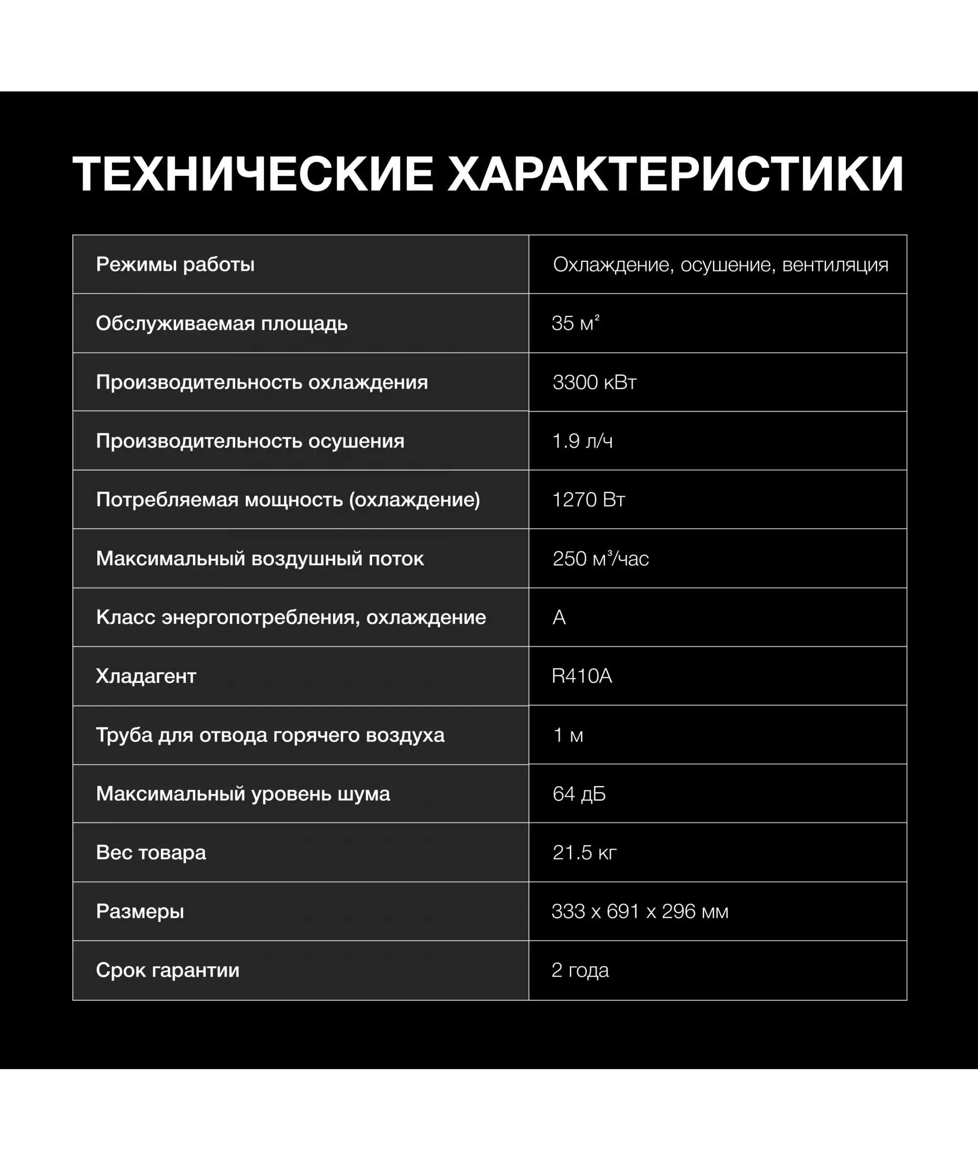 | Режимы работы | охлаждение, осушение, вентиляция |