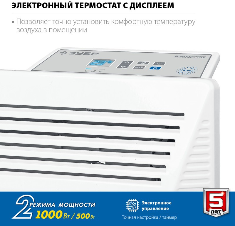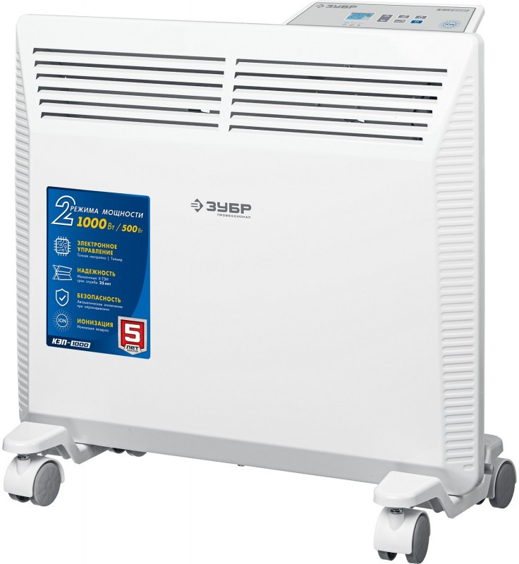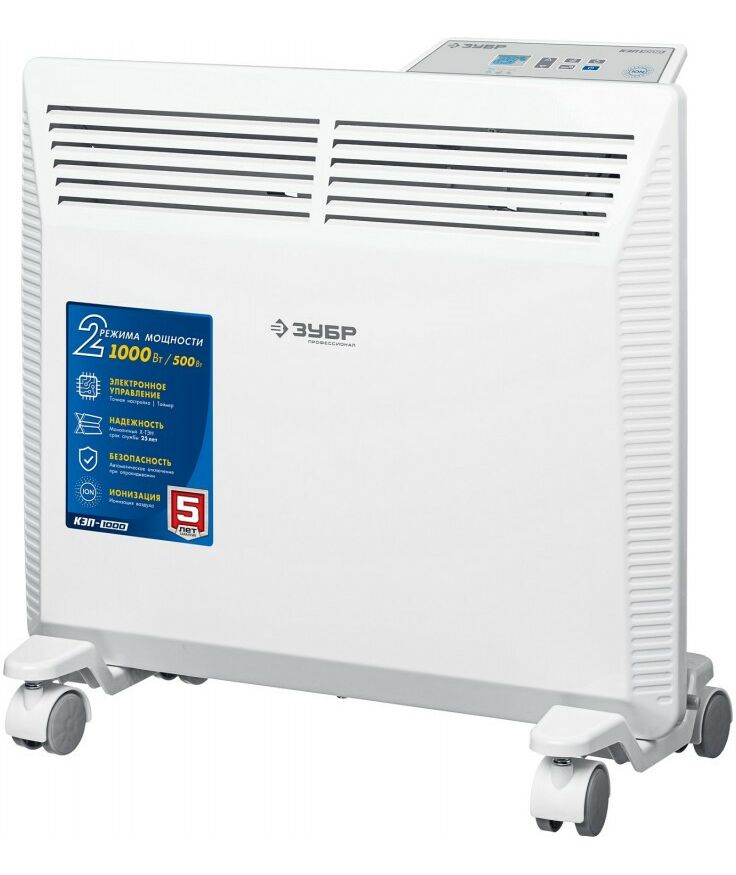 - Электрический конвектор ЗУБР ПРОФЕССИОНАЛ мощностью 1000 Вт - подойдет для обогрева любых домашних и офисных помещений площадью до 15 м2. Электронный терморегулятор и ионизация воздуха обеспечит равномерный нагрев помещения и создаст неповторимую атмосферу комфорта.