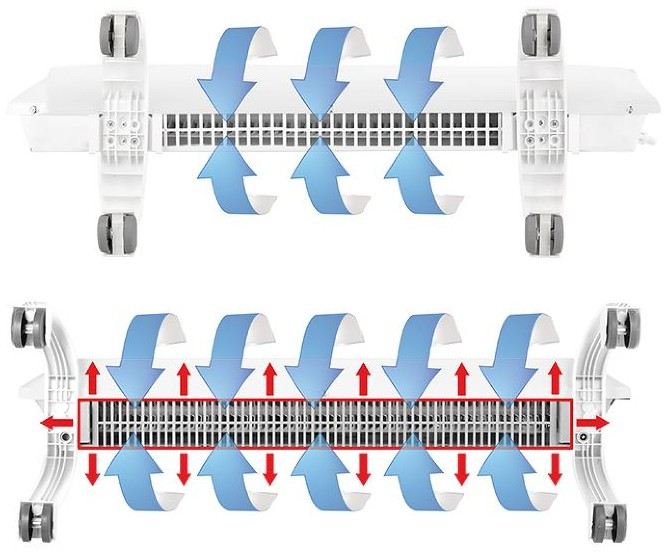 - Запатентованная конструкция жалюзи обеспечивает равномерную конвекцию, снижает температуру корпуса и предотвращает попадание мелких частиц внутрь конвектора