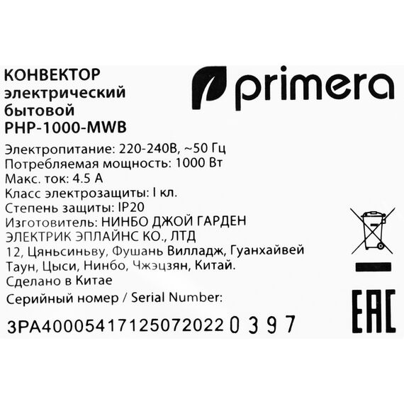 Конвектор Primera PHP-1000-MWB 1000Вт белый