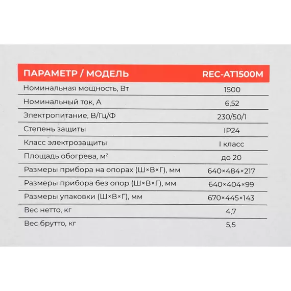 | Площадь обогрева (макс) | 20 м2 |