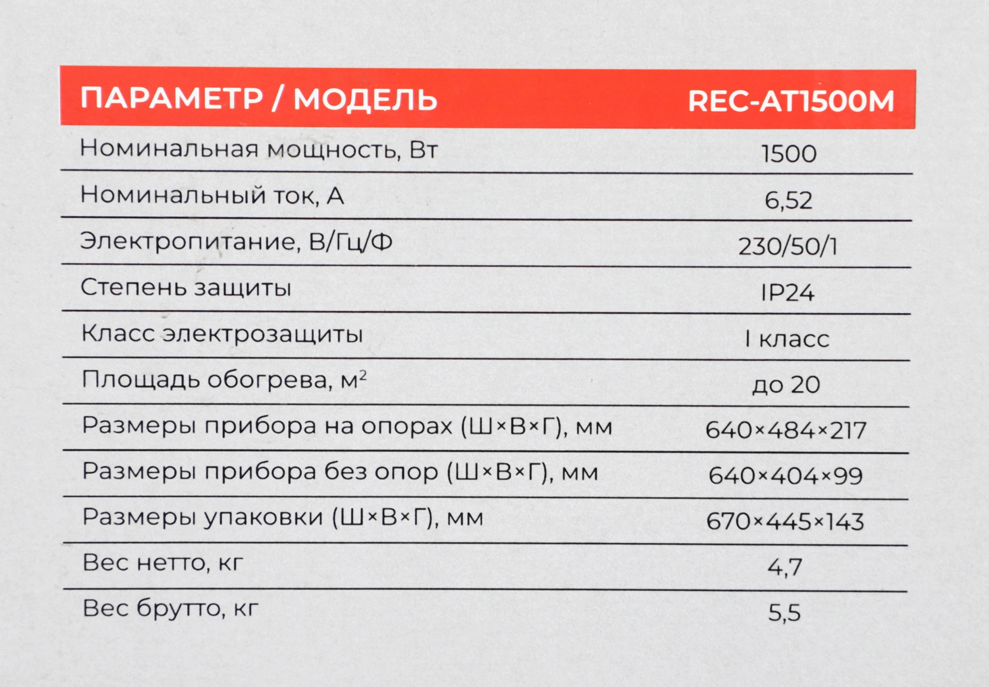 | Класс защищенности обогревателя | IP24 |