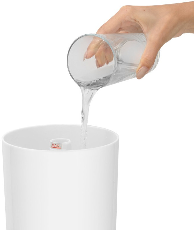 - Увлажнитель оснащен резервуаром для воды емкостью 2,5 л: ее хватит надолго, с учетом расхода в 220 мл/ч. По желанию, таймер можно установить на период времени до 8 часов — например, на ночь, чтобы вы могли спокойно спать и дышать свежим воздухом. Для особого комфорта использования в приборе предусмотрен верхний долив воды