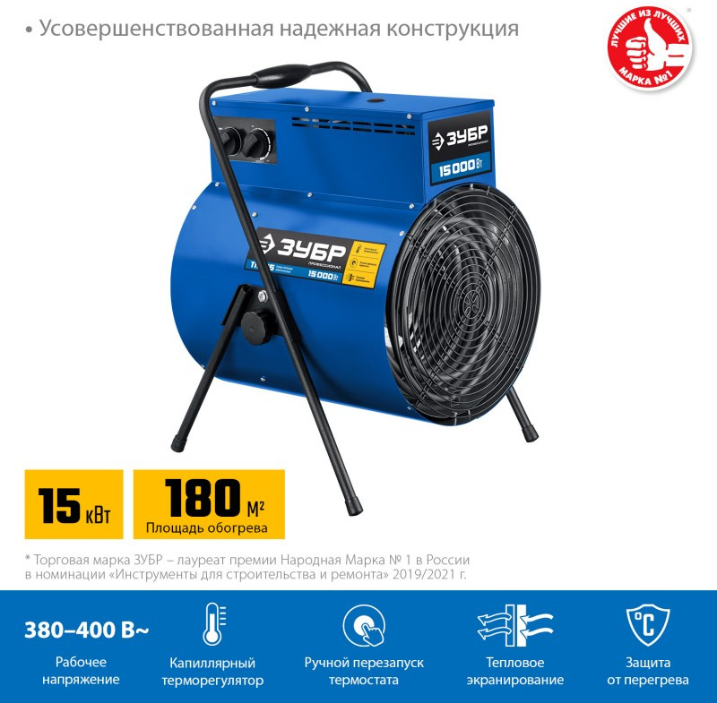 - Профессиональные электрические тепловые пушки с питанием от трехфазной электрической сети эффективны для быстрого и направленного обогрева складских и производственных помещений, ангаров и мастерских, благодаря большой площади нагревательных элементов и мощным двигателем вентилятора. Надёжная доработанная конструкция,обеспечивают защиту как пользователя, так и тепловой пушки в случае возникновения нештатных ситуаций. ЗУБР - тепло всегда и везде