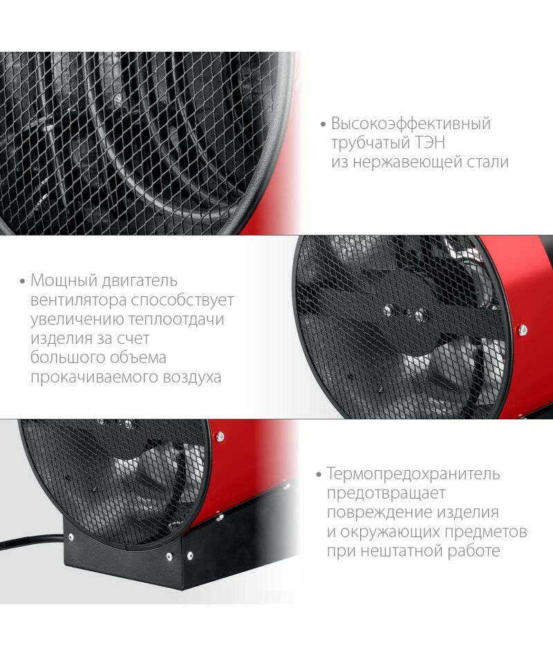 - Цилиндрическая форма корпуса для большей равномерности воздушного потока, благодаря чему повышается эффективность обогрева за счет лучшего обдува ТЭНов