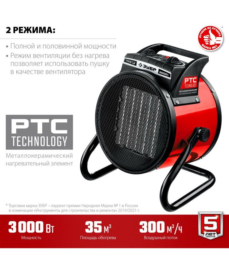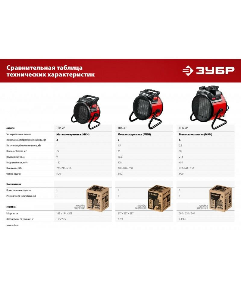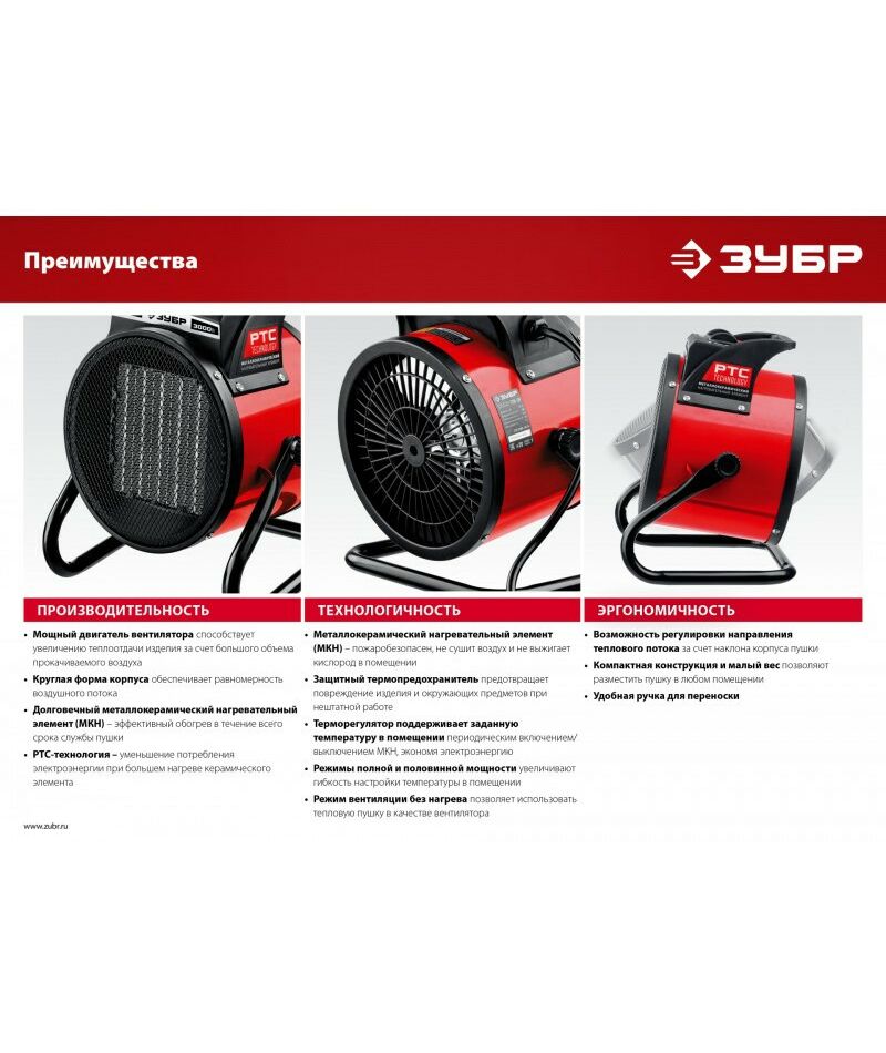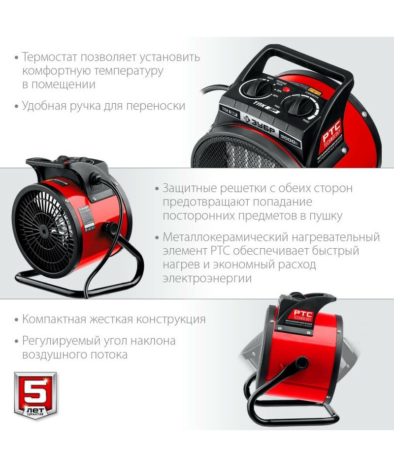 - Электрические тепловые пушки ЗУБР серии ТПК–Р компактные пушки в круглом корпусе для обогрева небольших помещений. Благодаря небольшим размерам тепловую пушку легко переносить и хранить. Устройства оснащены долговечным металлокерамическим нагревательный элементом, обеспечивающий быстрый равномерный нагрев, экономное потребление электроэнергии и не сушит воздух. Механический терморегулятор поддерживает нужную температуру нагрева. За счет большой площади теплообмена и небольшой температуры нагрева элемента, воздух быстро прогревается. Изделие можно оставлять на долгое время и не бояться за сохранность помещения, так как конструктивные меры безопасности защищают Вас и изделие при нештатных ситуациях.