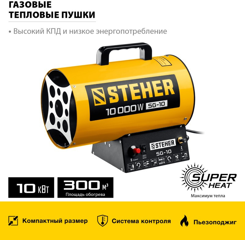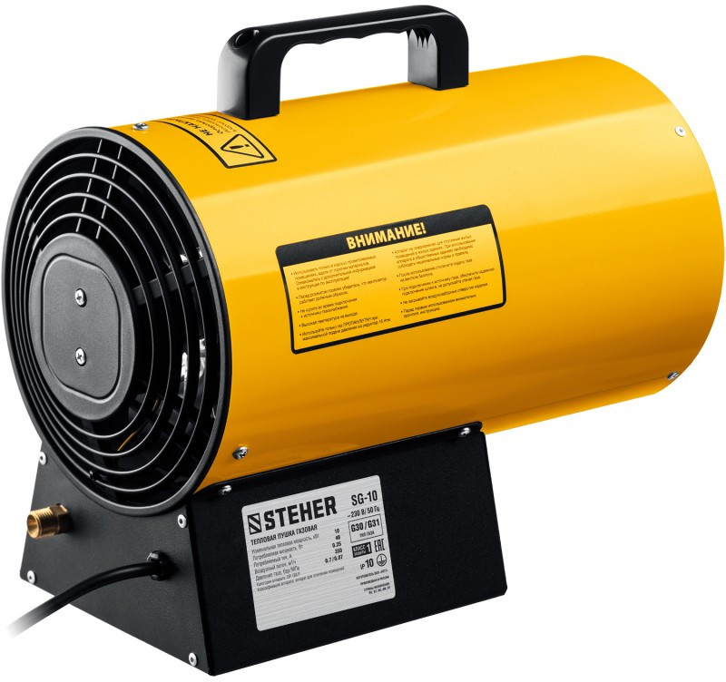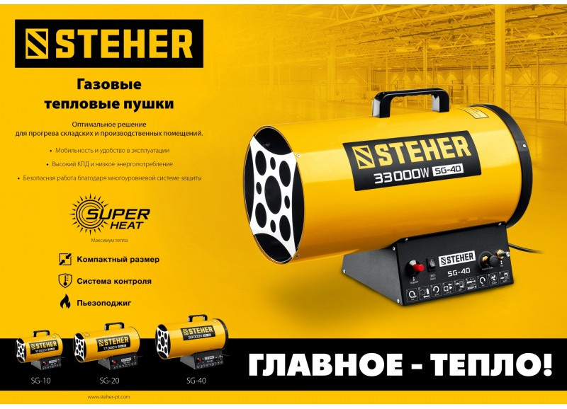 - Газовые тепловые пушки STEHER - мощные теплогенераторы, работающие наиболее распространенном виде топлива. Компактный корпус, контроль наличия пламени, биметаллический термопредохранитель и двойное теплоэкранирование. Оптимальное решение для прогрева складских и производственных помещений.