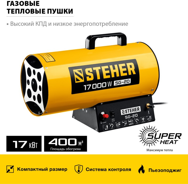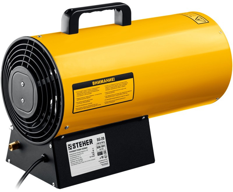 - Газовые тепловые пушки STEHER - мощные теплогенераторы, работающие наиболее распространенном виде топлива. Компактный корпус, контроль наличия пламени, биметаллический термопредохранитель и двойное теплоэкранирование. Оптимальное решение для прогрева складских и производственных помещений.