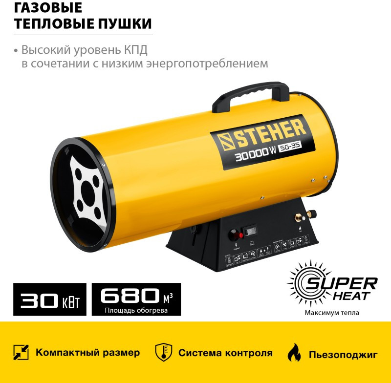 - Газовые тепловые пушки STEHER - мощные теплогенераторы, работающие наиболее распространенном виде топлива. Компактный корпус, контроль наличия пламени, биметаллический термопредохранитель и двойное теплоэкранирование. Оптимальное решение для прогрева складских и производственных помещений.
