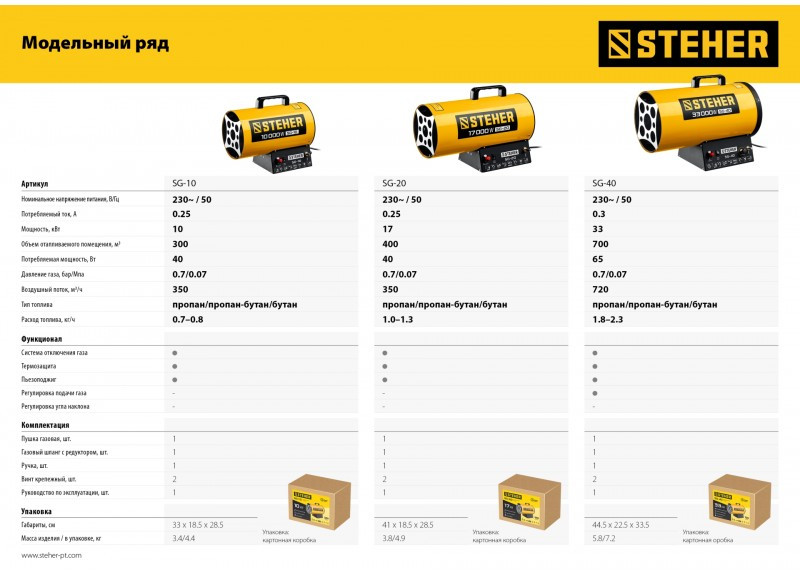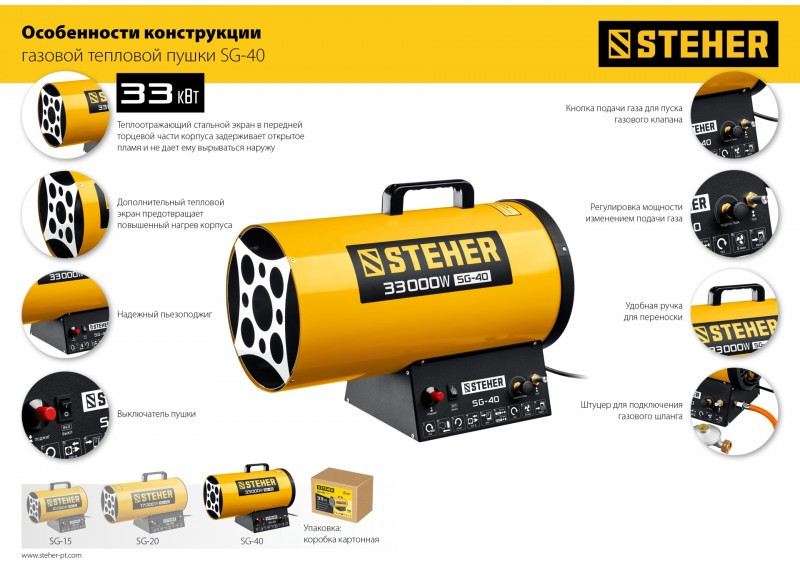 - Газовые тепловые пушки STEHER - мощные теплогенераторы, работающие наиболее распространенном виде топлива. Компактный корпус, контроль наличия пламени, биметаллический термопредохранитель и двойное теплоэкранирование. Оптимальное решение для прогрева складских и производственных помещений.