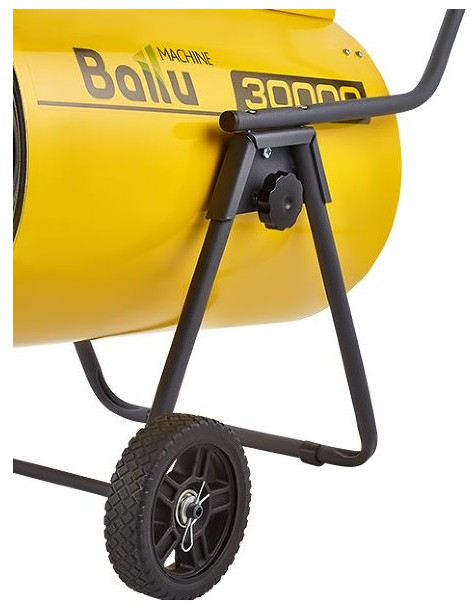 - За счет колёсного шасси тепловая пушка легко перемещается и устанавливается, а наличие барашковых винтов позволяет точно регулировать угол наклона корпуса