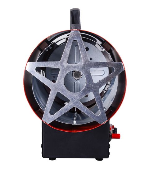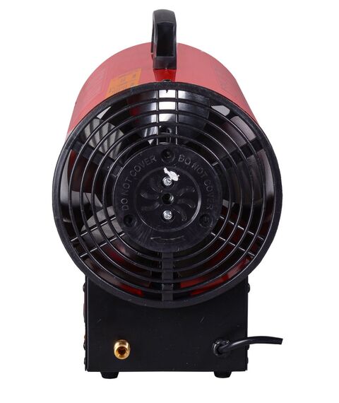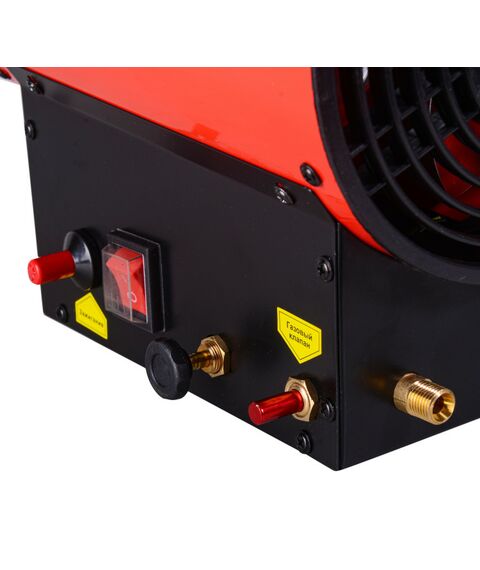 Сжиженный газ создает высокую температуру в камере сгорания тепловой пушки. Электрическая энергия однофазной сети необходима для работы вентилятора и функционирования автоматических узлов. Зажигание осуществляется с помощью пьезоэлектрического элемента. Теплопушка отличается экономичным расходом топлива 0,6-0,9 кг/час. Подача газа осуществляется под давлением 0,7 Бар. Контроль пламени происходит с помощью термодатчика из биметалла. Для обеспечения пожарной безопасности предусмотрена система защиты от перегрева. При отсоединении газового шланга тепловая пушка выполняет функцию вентилятора.