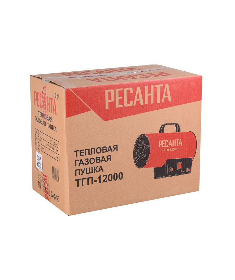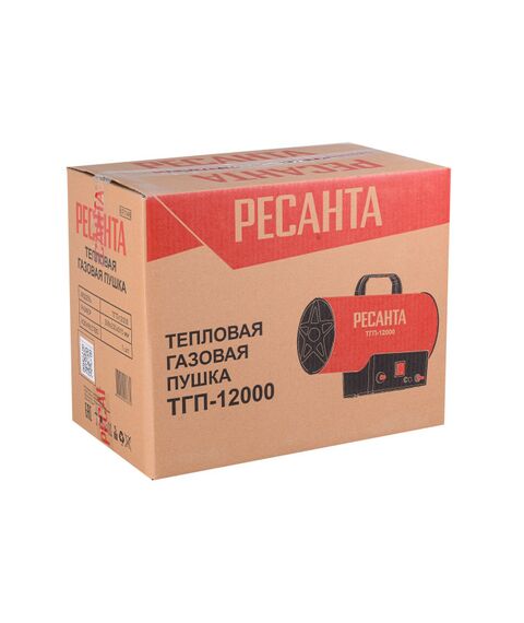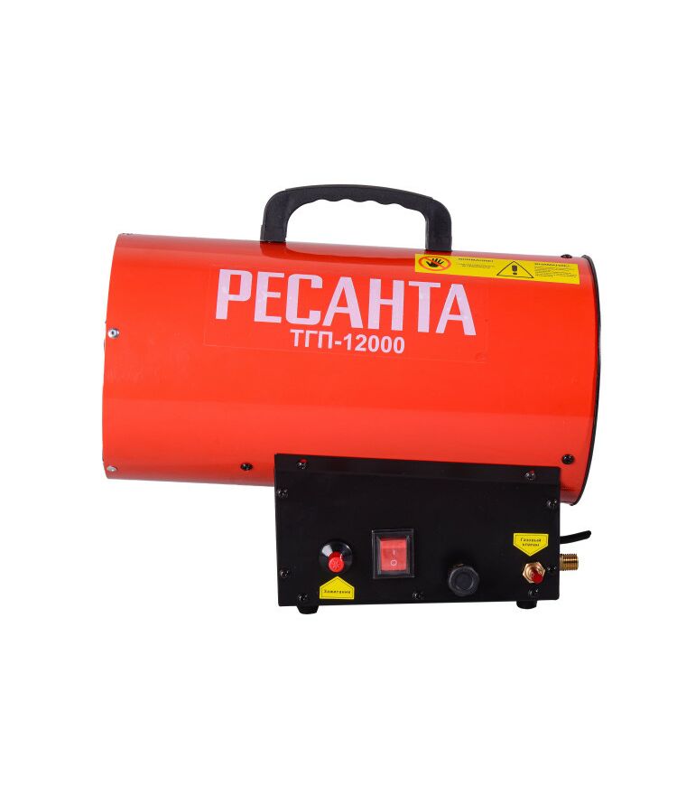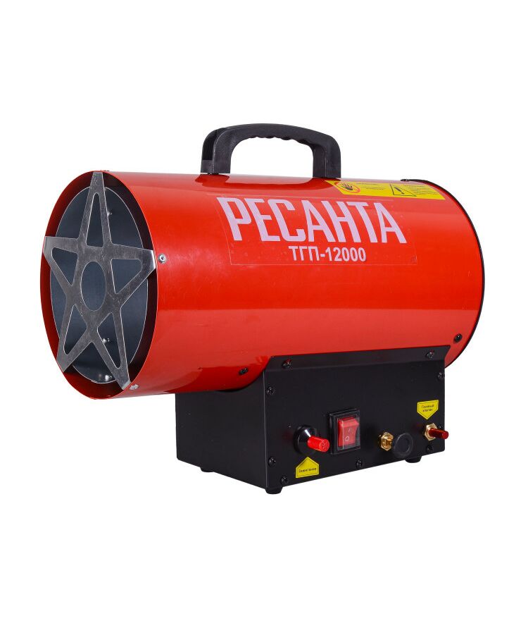 Газовая тепловая пушка Ресанта ТГП-12000 - эффективный нагреватель воздуха, использующий в качестве топлива сжиженные газы: пропан, пропан-бутан, бутан. Применяется для обогрева складских помещений, цехов, ремонтных мастерских площадью до 120 м², а также при монтаже натяжных потолков, для просушки окрашенных стен и штукатурки. Тепловая мощность имеет диапазон 7-12 кВт. Двигатель обеспечивает воздушный поток производительностью 370 м³/час.