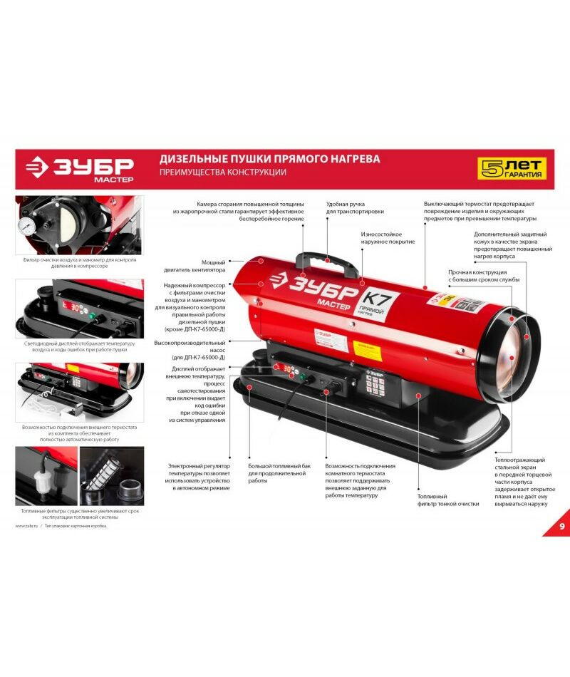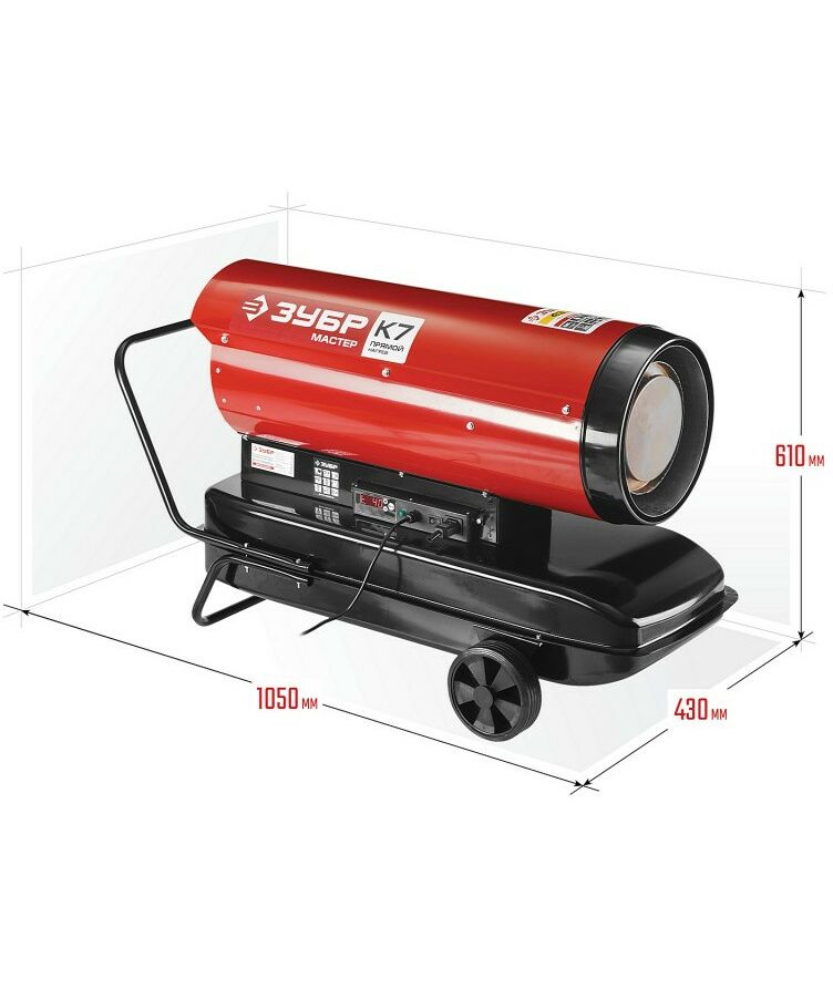 Тепловая пушка дизельная Зубр ДП-К7-52000-Д 220В, 43,0кВт, 1100 м.куб/час, 55,5л, 4,0кг/ч, дисплей, подкл. внеш термост, датчик уровня топлива