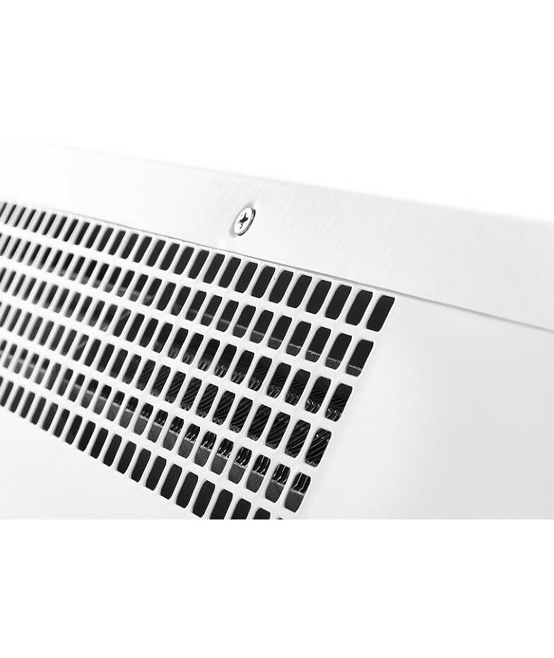- Передняя панель без перфорации блокирует распространение шума от вентиляционных колес направляя его в потолок а не в проходящих людей, что делает завесу значительно тише аналогов в классическом корпусе