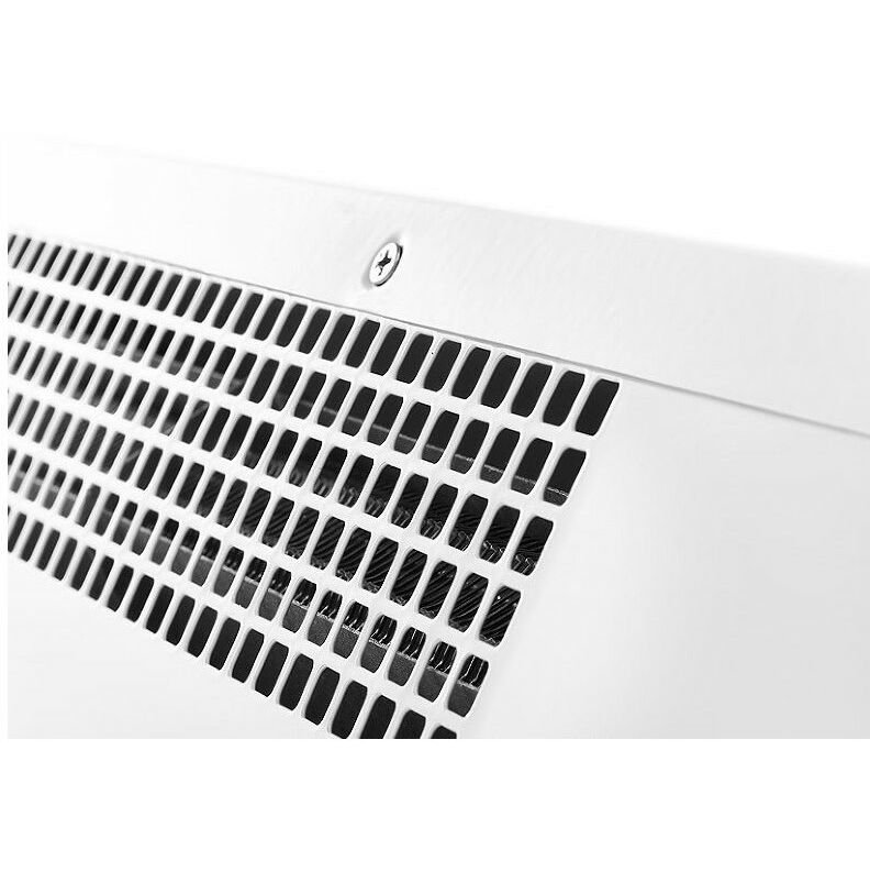 - Передняя панель без перфорации блокирует распространение шума от вентиляционных колес направляя его в потолок, а не в проходящих людей, что делает завесу значительно тише аналогов в классическом корпусе