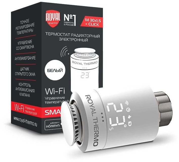 - Термостат радиаторный электронный ROYAL THERMO Smart Heat с LED дисплеем и регулятором температуры. Точность установки температуры - 1°С