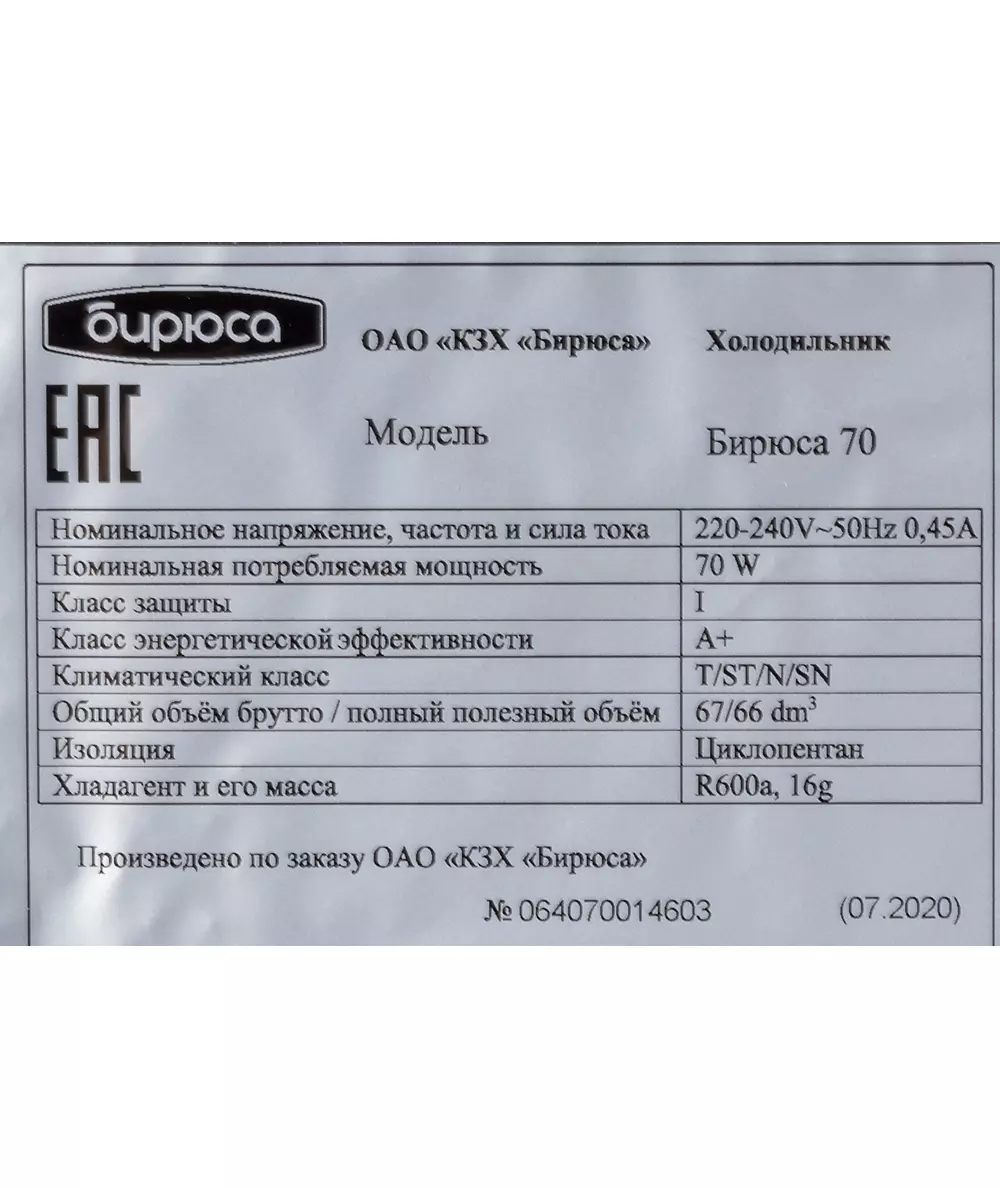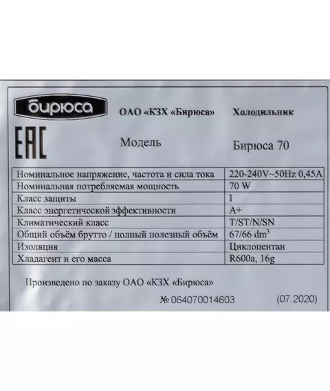 Холодильник Бирюса Б-70 1-нокамерн. белый мат