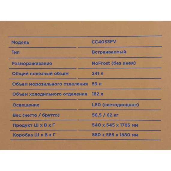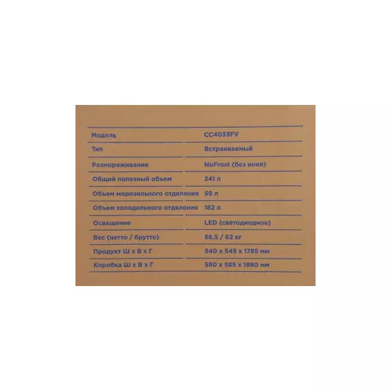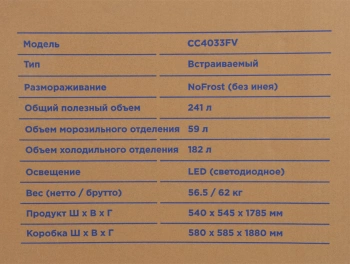 | Общий объем морозильной камеры | 59 л |